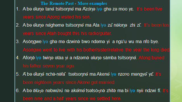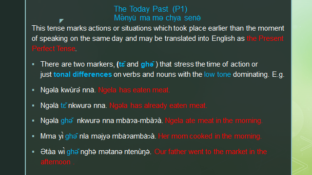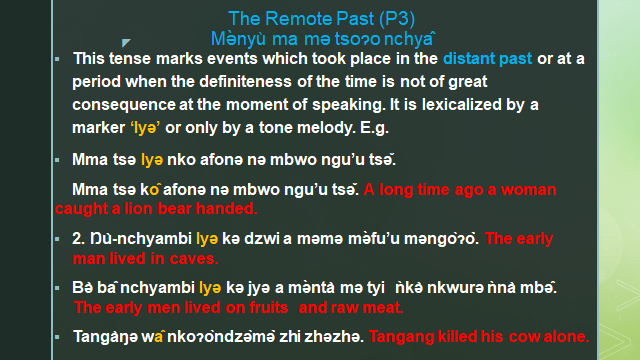 The Nkwen Language makes a distinction of three main tenses, the Present the Past, and the Future Tenses. The past and the future tenses are subdivided into three forms each. The differences between these tenses in some cases are shown by different tense markers which come before the verb or simply tone melody on verbs and nouns.